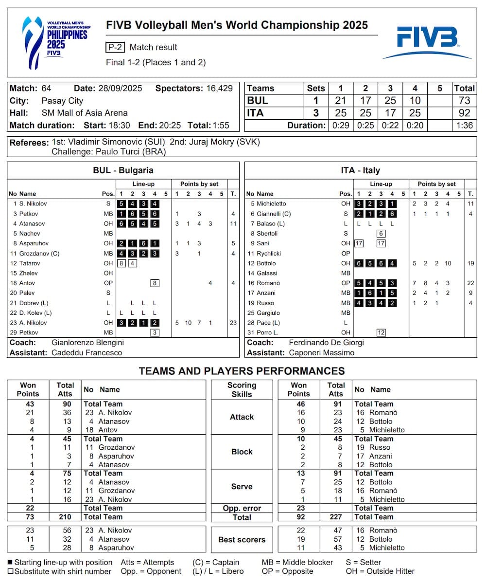 Italy defeated Bulgaria 3-1 in the 2025 Men’s World Championship final — a commanding performance with just one slip by Italy in the 3th set.