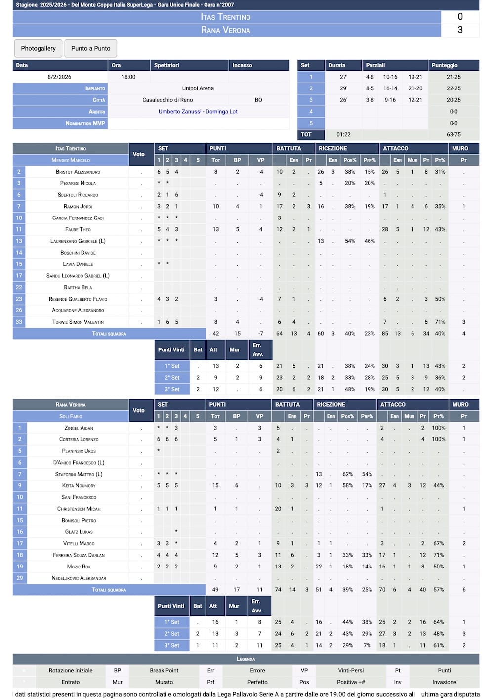 Rana Verona beat Itas Trentino 3–0 (25–21, 25–22, 25–20) in the 2025-2026 Coppa Italia Final, sealing the club’s first national cup with a dominant performance from start to finish.